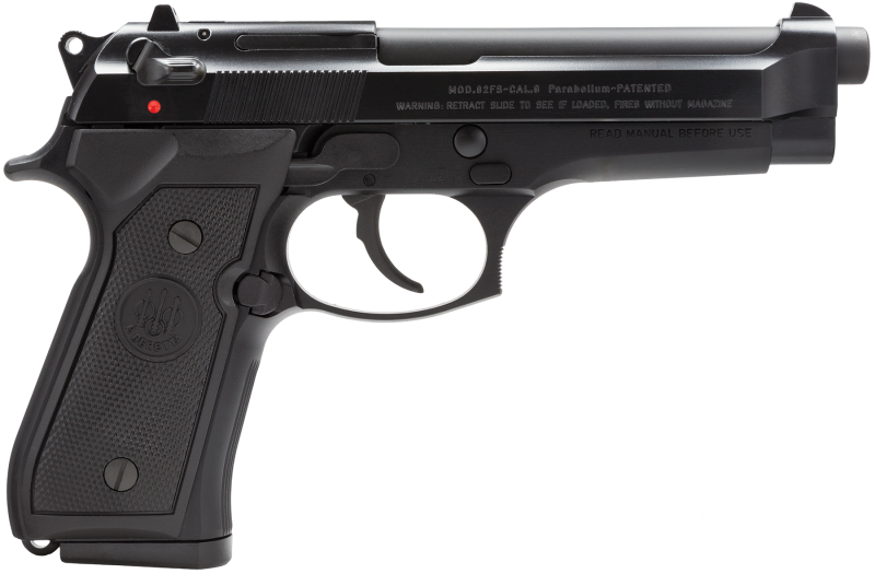 92FS Features The Beretta 92 FS semi-automatic pistol operates on a short recoil, delayed blowback system, leading to faster cycle times, exceptional accuracy, and greater reliability. The chrome-lined barrel provides extreme corrosion resistance, while the deeply-recessed combat muzzle crown protects the rifling. The open top slide virtually eliminates jamming and stove piping allows for one cartridge at a time. The rear sight is designed to provide a front projection so that in an emergency, the user may retract the slide single-handedly by pushing the rear sight against the edge of a table or door. The Beretta exclusive Bruniton non-reflective black coating is a superior corrosion and wear-resistant finish. Its reversible magazine release is positioned next to the trigger guard for either right or left-handed shooters. This model has a black frame, black Burniton slide, and a 15-round magazine. 92FS Specifications Caliber: 9mm Luger Model: 92FS Series: Italy Frame Finish: Black Action: SA / DA Barrel Length Range: 4″ to 4.99″ Slide Description: Black Bruniton Steel Capacity: 15+1 Frame Material: Aluminum Grips: Black Polymer Hand: Right OAL: 8.50″ Safety: Ambidextrous Safety, Decocker Sight Configuration: 3-Dot Sight Style: Contrast Weight: 33.30 oz Barrel Length: 4.90″