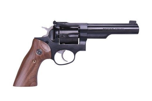 FAMILY:GP100 Series MODEL:GP100 TYPE:Revolver ACTION:Double / Single Action FINISH:Blue STOCK/FRAME:Steel Frame STOCK/GRIPS:Smooth Walnut WEIGHT:39 oz. CALIBER/GAUGE:357 Magnum | 38 Special CAPACITY:6 BARREL:5″ RATE-OF-TWIST:1-in-18-3/4 SIGHTS:Gold Bead Front/Adj Rear SAFETY:Transfer Bar ADDL INFO:Half Lug Barrel/Fluted Cyl GUN CASE:Plastic